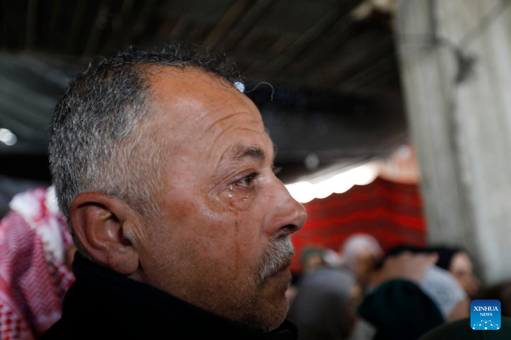 A relative of Palestinian boy Ammar Ta'amra, who was shot dead by Israeli army, mourns during his funeral in the town of Tuqu', southeast of Bethlehem in the West Bank, on Dec. 16, 2025. The 16-year-old Palestinian, Ammar Ta'amra, was shot dead, by the Israeli army during a military raid on Tuqu' on Monday, the Palestinian health ministry said. (Photo by Mamoun Wazwaz/Xinhua)