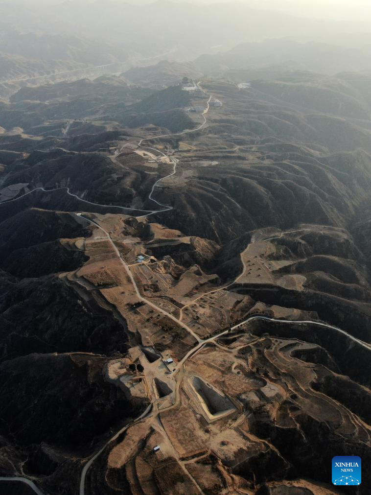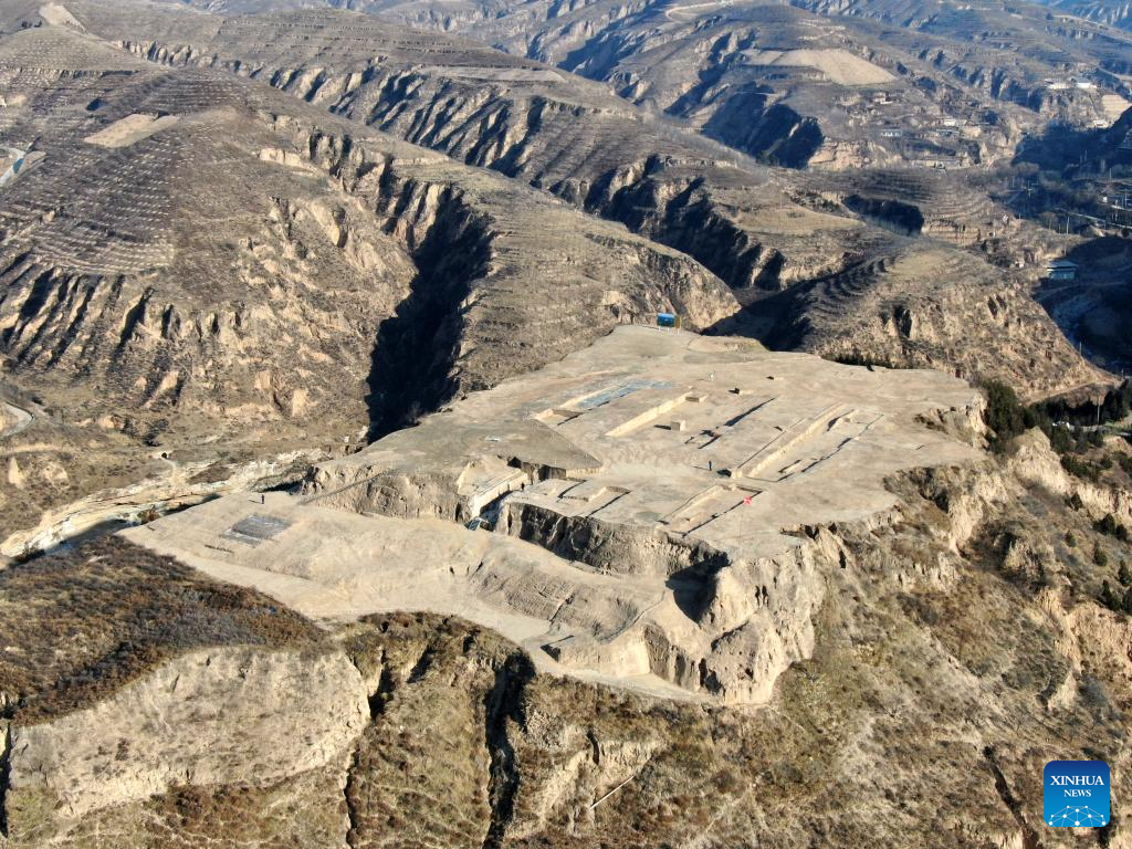 An aerial drone photo taken on Dec. 8, 2025 shows part of the Zhaigou site in Qingjian County, northwest China's Shaanxi Province. The Zhaigou site, a settlement site dating back to about 3,200 years ago, was listed as one of the major field archaeological discoveries during the sixth Shanghai Archaeology Forum (SAF2025) in east China's Shanghai on Tuesday. (Xinhua/Li Yibo)
