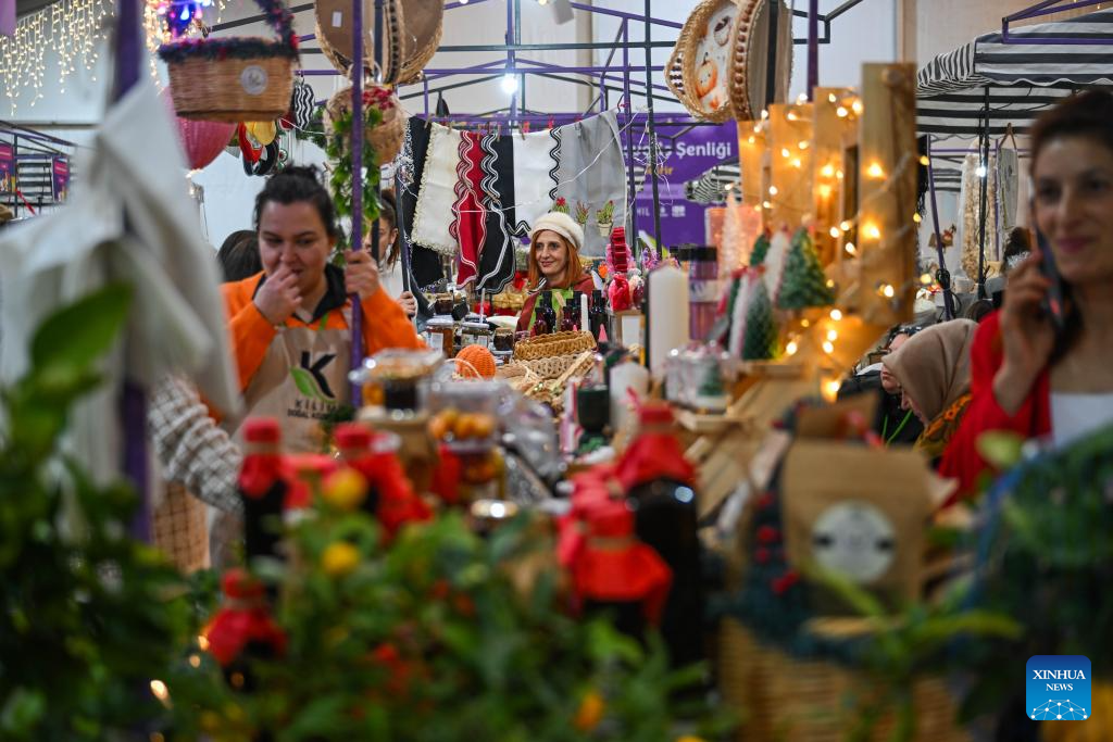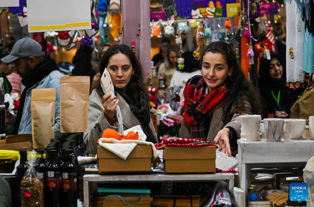 A New Year Shopping Festival is held at the Clock Tower Square of Galataport in Istanbul, Türkiye, Dec. 17, 2025. As the New Year approaches, tents have been set up at Clock Tower Square in Galataport for a New Year Shopping Festival, offering a variety of festive-themed goods. (Xinhua/Liu Lei)