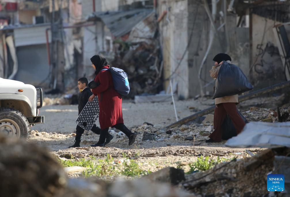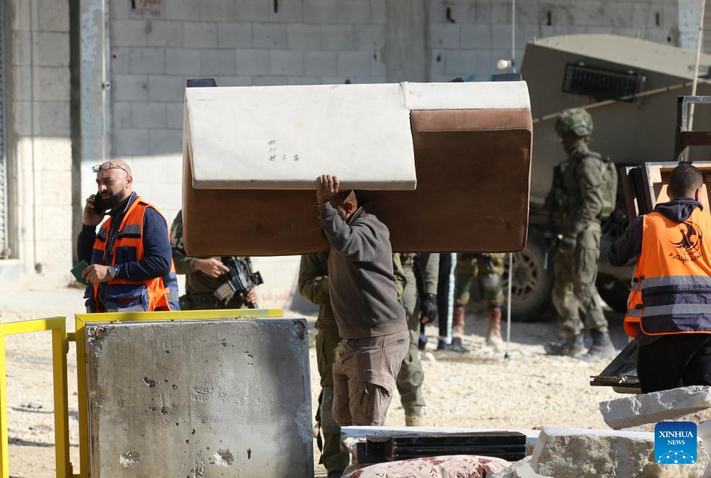 Palestinians carry their belongings in the Nur Shams refugee camp, east of Tulkarm in the West Bank, on Dec. 17, 2025. Previously the Israeli army announced the demolition of 25 homes in the Nur Shams refugee camp and allowed the homeowners to enter their homes and move their furniture and belongings on Wednesday morning. (Photo by Nidal Eshtayeh/Xinhua)