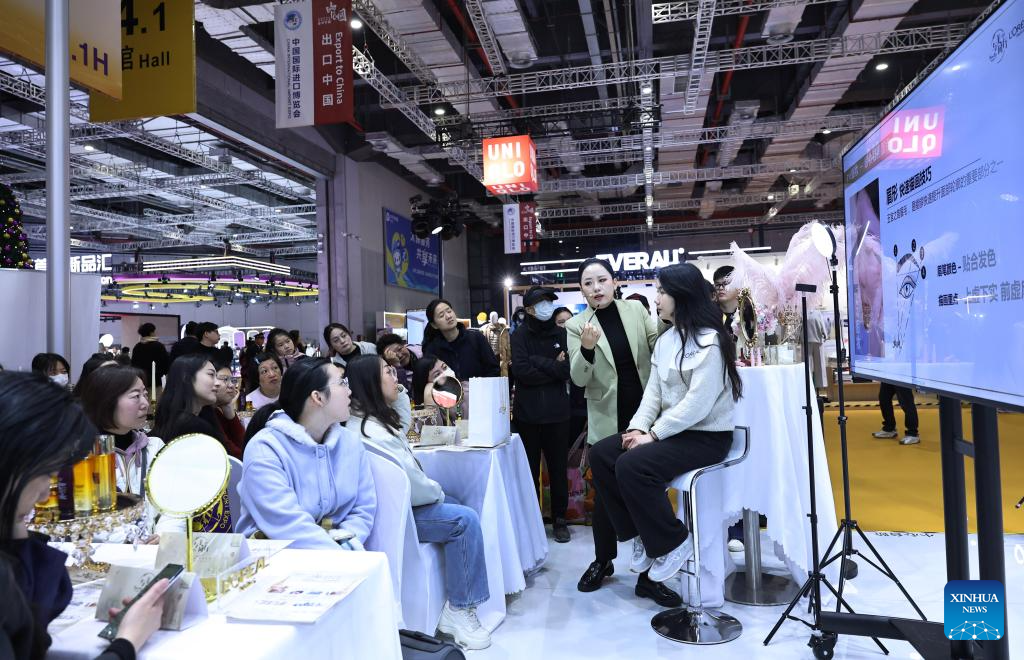 Visitors learn makeup skills at the L'Oreal stand at the CIIE U-Fair in the National Exhibition and Convention Center (Shanghai) in Shanghai, east China, Dec. 19, 2025.