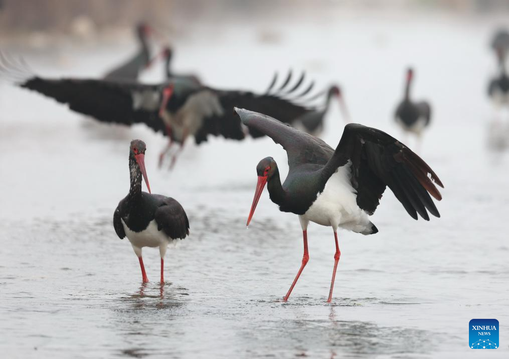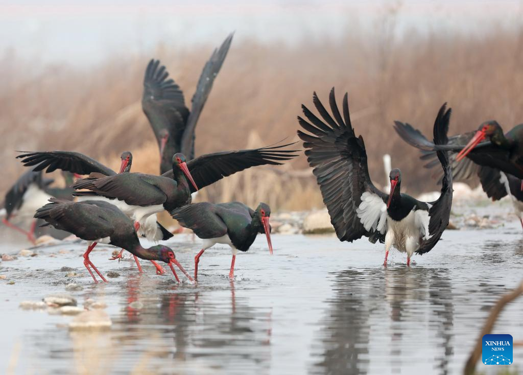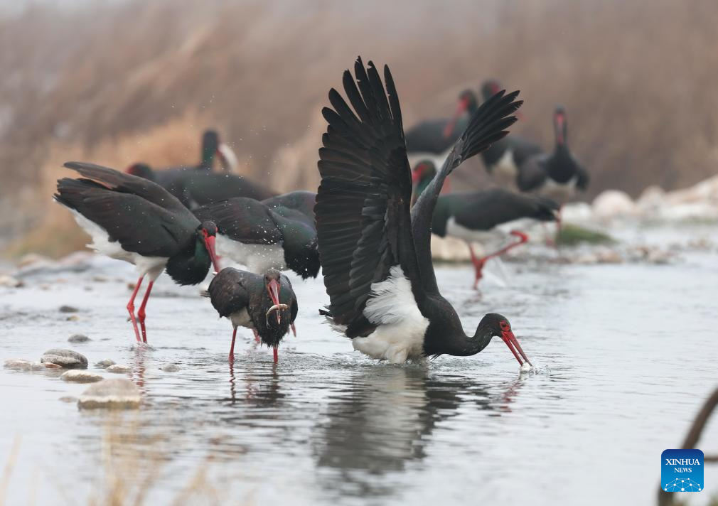 Black storks forage at Mianman River in Jingxing County, north China's Hebei Province, Dec. 19, 2025. Black stork is a migratory bird species under first-class national protection in China. (Xinhua/Yang Shiyao)