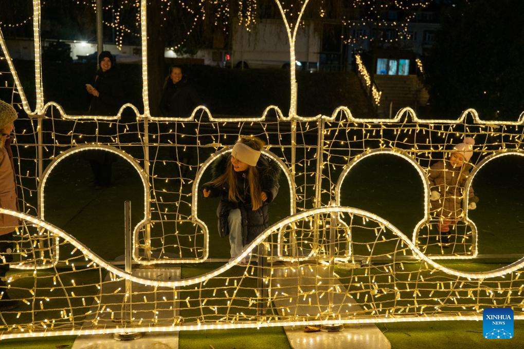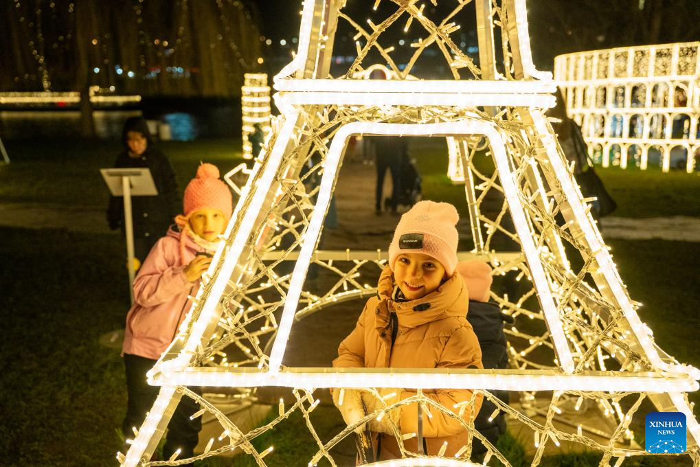 Children play at the Story of Lights themed park in Prague, the Czech Republic, Dec. 19, 2025. An Europe-themed light park illuminates the banks of the Vltava River in Prague, offering visitors an immersive journey of architecture and light. (Photo by Dana Kesnerova/Xinhua)