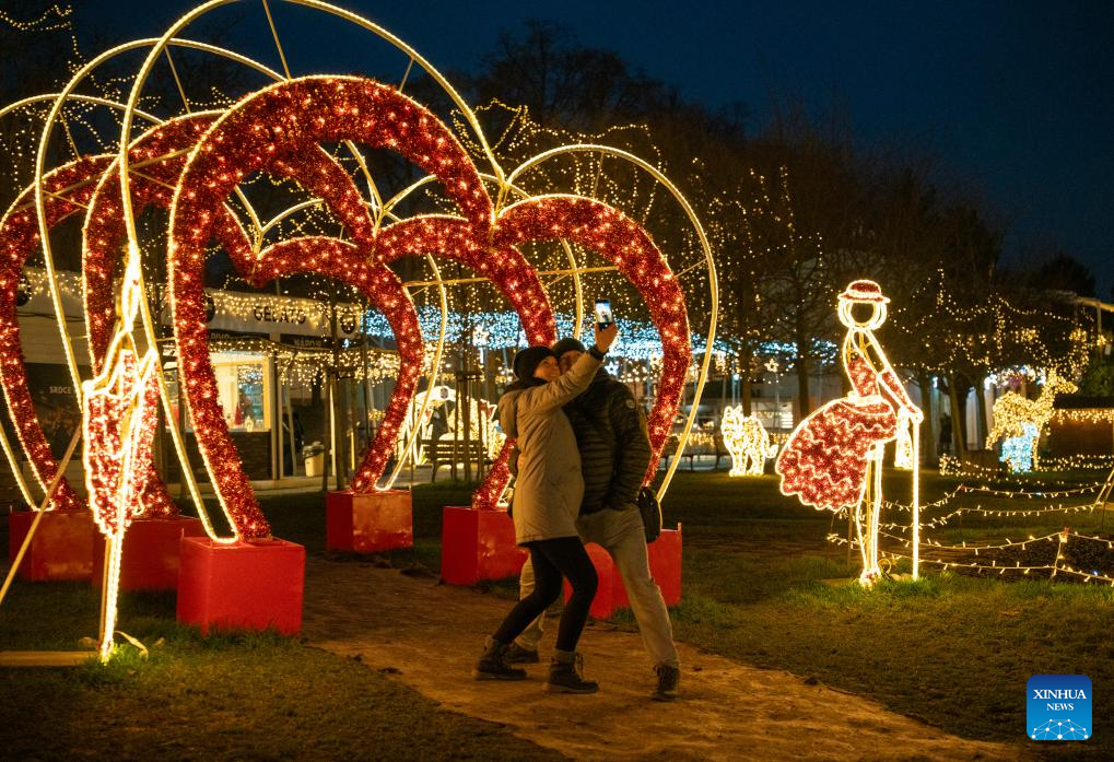 People pose for selfies at the Story of Lights themed park in Prague, the Czech Republic, Dec. 19, 2025. An Europe-themed light park illuminates the banks of the Vltava River in Prague, offering visitors an immersive journey of architecture and light. (Photo by Dana Kesnerova/Xinhua)