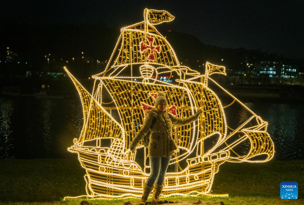 A woman poses for photos at the Story of Lights themed park in Prague, the Czech Republic, Dec. 19, 2025. An Europe-themed light park illuminates the banks of the Vltava River in Prague, offering visitors an immersive journey of architecture and light. (Photo by Dana Kesnerova/Xinhua)