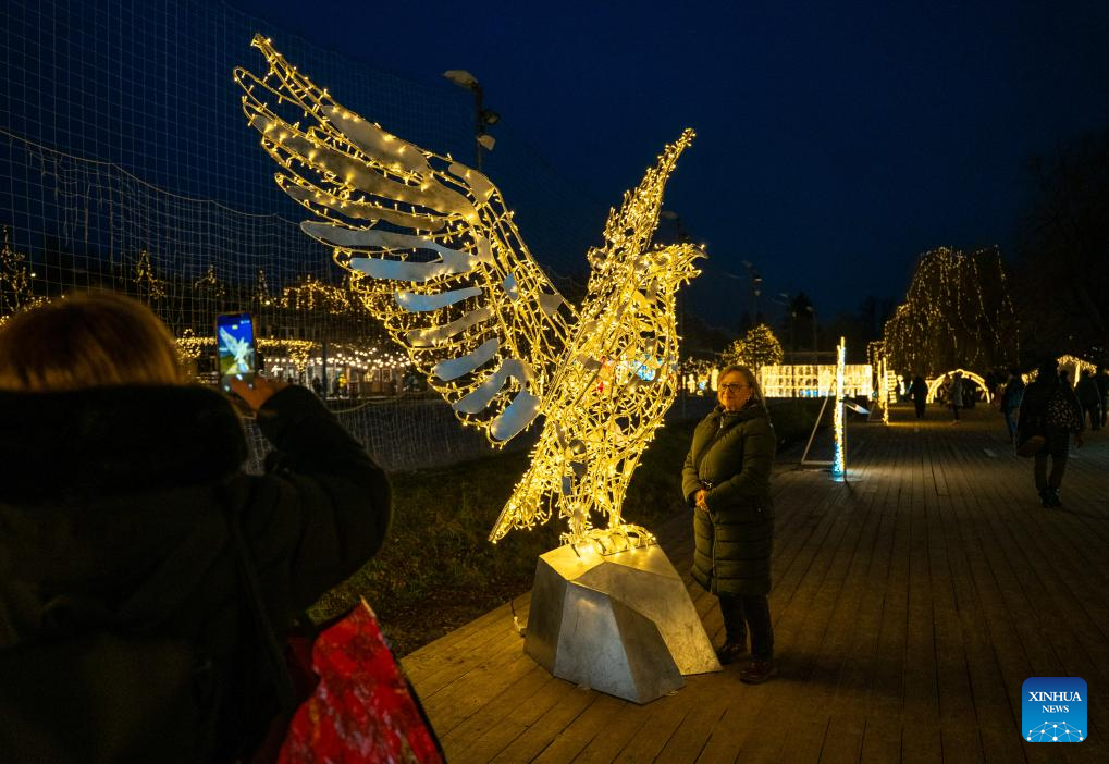 People visit the Story of Lights themed park in Prague, the Czech Republic, Dec. 19, 2025. An Europe-themed light park illuminates the banks of the Vltava River in Prague, offering visitors an immersive journey of architecture and light. (Photo by Dana Kesnerova/Xinhua)