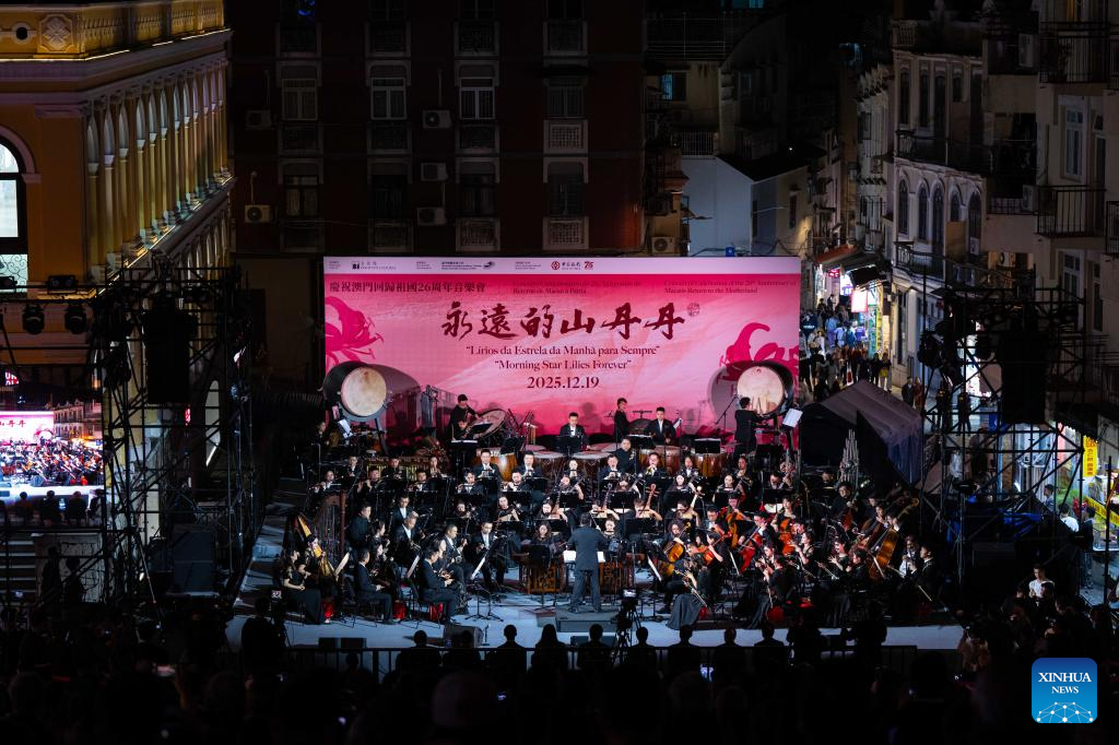 Musicians perform at a concert celebrating the 26th anniversary of Macao's return to the motherland in Macao, south China, Dec. 19, 2025. Titled "Morning Star Lilies Forever", the concert was held here on Friday. (Xinhua/Cheong Kam Ka)