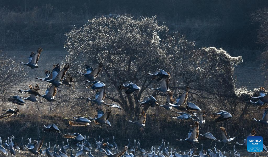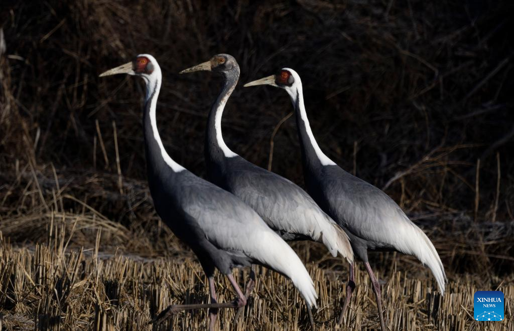 This photo taken on Dec. 21, 2025 shows white-naped cranes in Paju in Gyeonggi Province, South Korea. (Photo by Jun Hyosang/Xinhua)