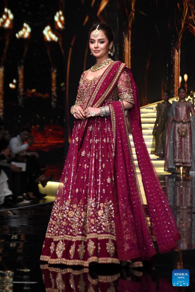 A model presents a creation during the Hum Bridal Couture Week fashion show in Lahore, Pakistan on Dec. 20, 2025. (Photo by Sajjad/Xinhua)