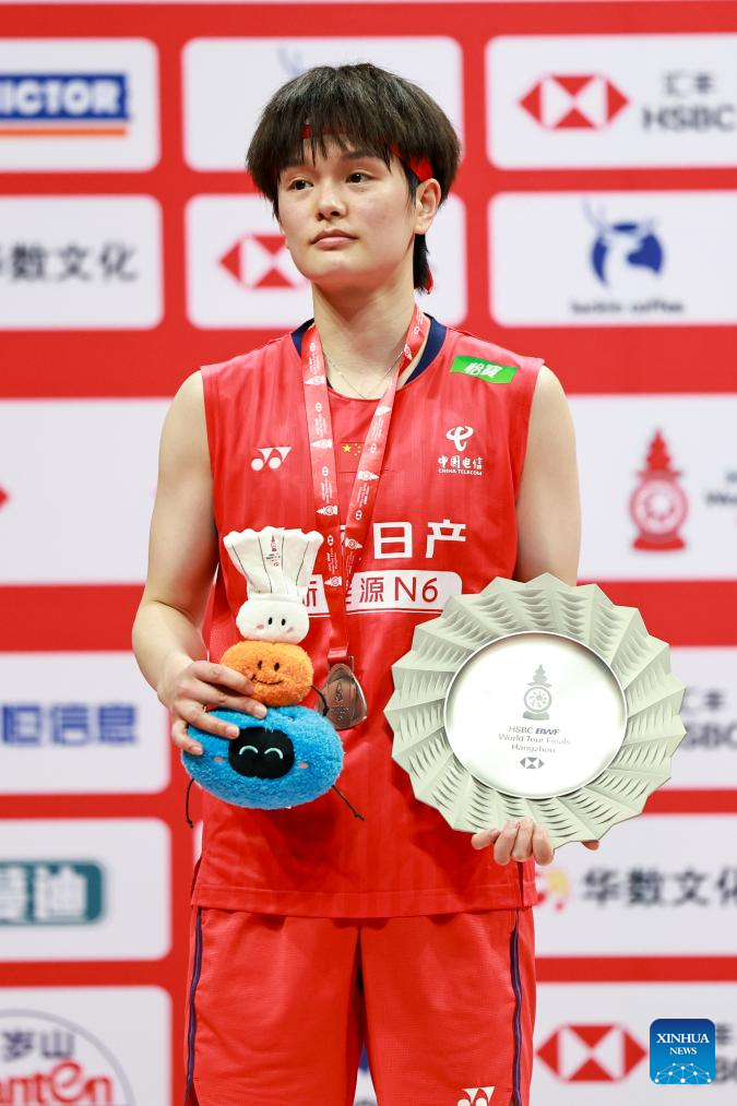 Wang Zhiyi of China poses at the awarding ceremony after the women's singles final between Wang Zhiyi of China and An Se Young of South Korea at BWF World Tour Finals 2025 in Hangzhou, east China's Zhejiang Province, Dec. 21, 2025. (Xinhua/Jiang Han)
