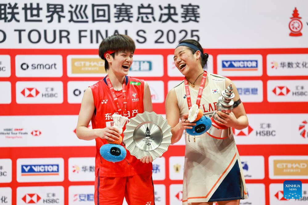 An Se Young (R) of South Korea and Wang Zhiyi of China pose at the awarding ceremony after their women's singles final at BWF World Tour Finals 2025 in Hangzhou, east China's Zhejiang Province, Dec. 21, 2025. (Xinhua/Jiang Han)