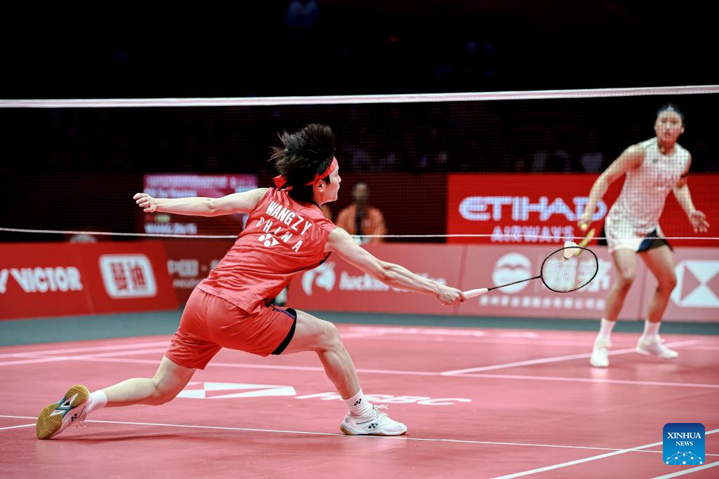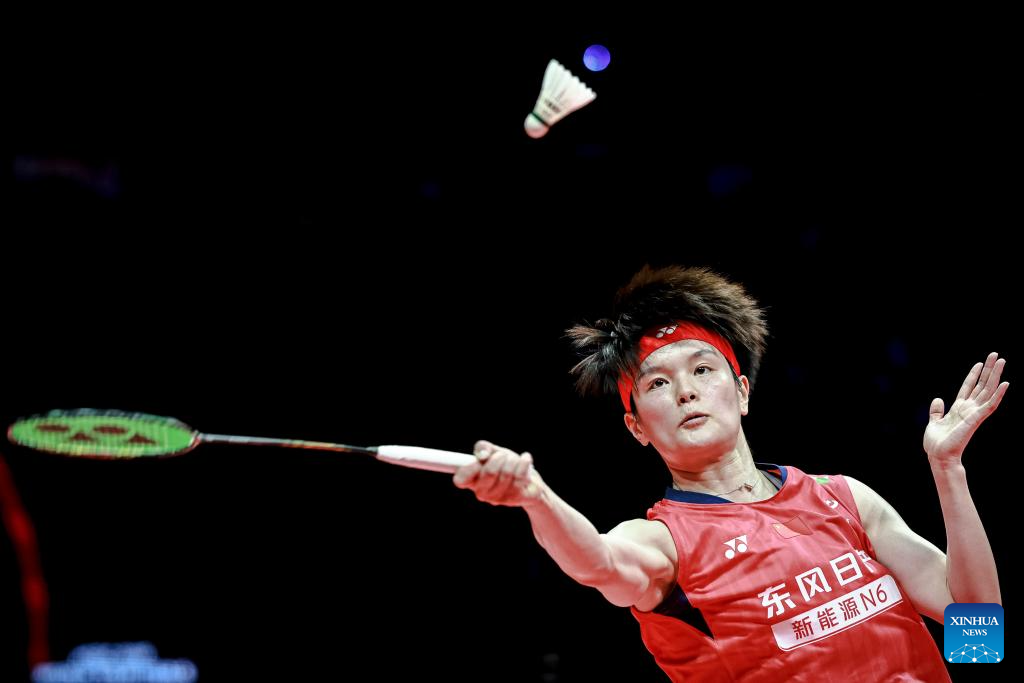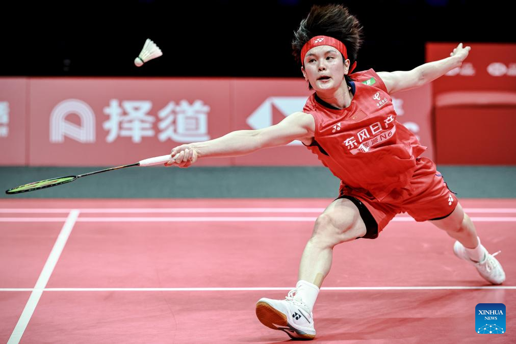 Wang Zhiyi of China hits a return during the women's singles final between Wang Zhiyi of China and An Se Young of South Korea at BWF World Tour Finals 2025 in Hangzhou, east China's Zhejiang Province, Dec. 21, 2025. (Xinhua/Jiang Han)