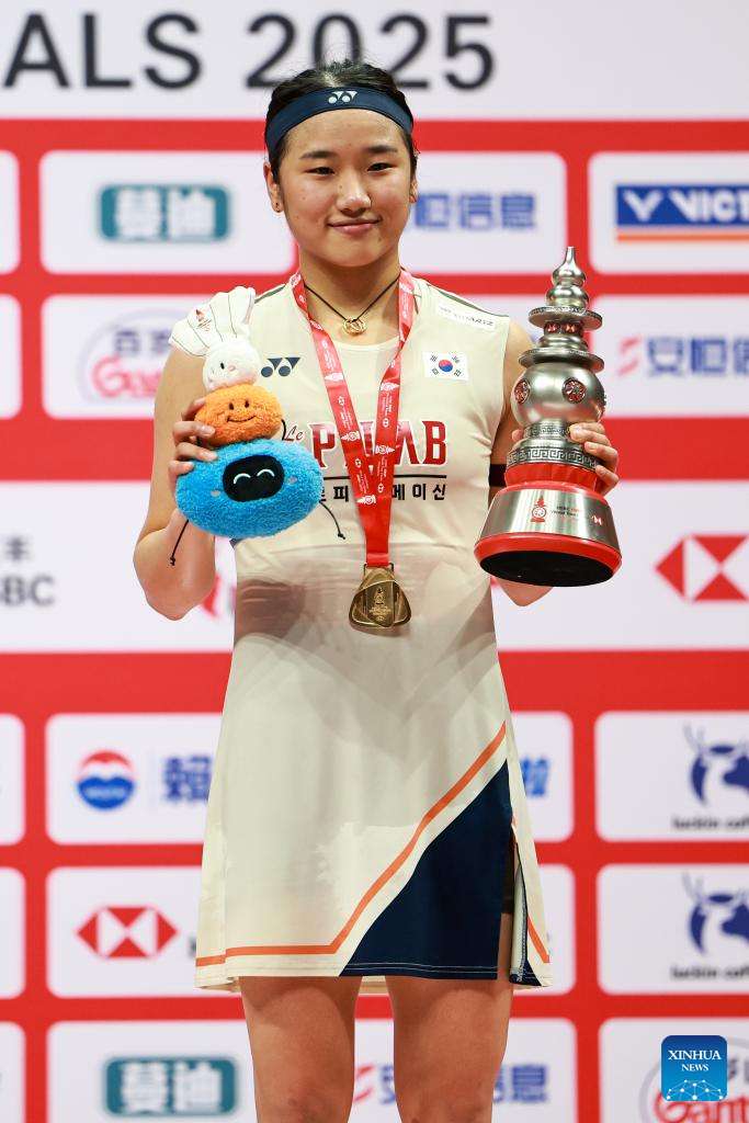 An Se Young of South Korea poses at the awarding ceremony after the women's singles final between Wang Zhiyi of China and An Se Young of South Korea at BWF World Tour Finals 2025 in Hangzhou, east China's Zhejiang Province, Dec. 21, 2025. (Xinhua/Jiang Han)
