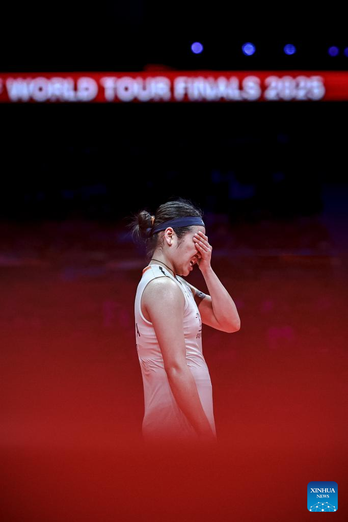 An Se Young of South Korea reacts during the women's singles final between Wang Zhiyi of China and An Se Young of South Korea at BWF World Tour Finals 2025 in Hangzhou, east China's Zhejiang Province, Dec. 21, 2025. (Xinhua/Jiang Han)