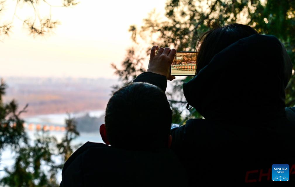 Visitors take pictures of the Seventeen-Arch Bridge with the sunset glow shining through its arches at the Summer Palace in Beijing, capital of China, Dec. 21, 2025. (Xinhua/Chen Yehua)