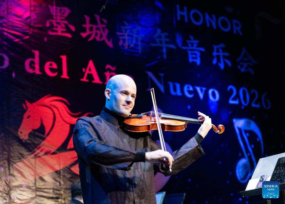 A musician plays the violin at a New Year concert in Mexico City, the capital of Mexico, on Dec. 20, 2025. The concert featuring both traditional Chinese music and works from the global repertoire was open to the public free of charge. (Xinhua/Li Mengxin)