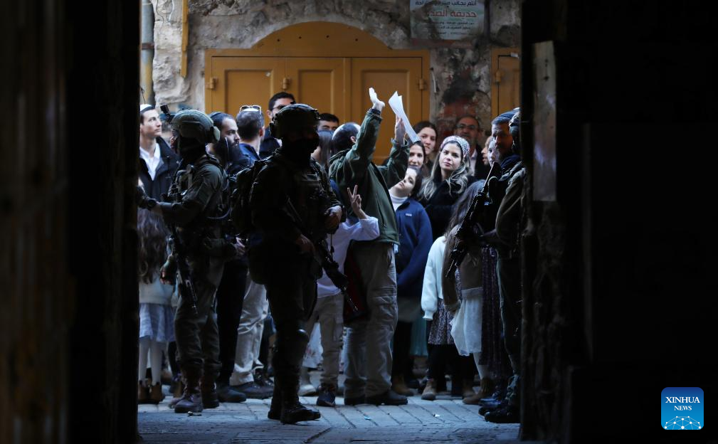 Members of Israeli forces secure the streets for Israeli settlers in the Old City of Hebron in the southern West Bank, on Dec. 20, 2025. (Photo by Mamoun Wazwaz/Xinhua)
