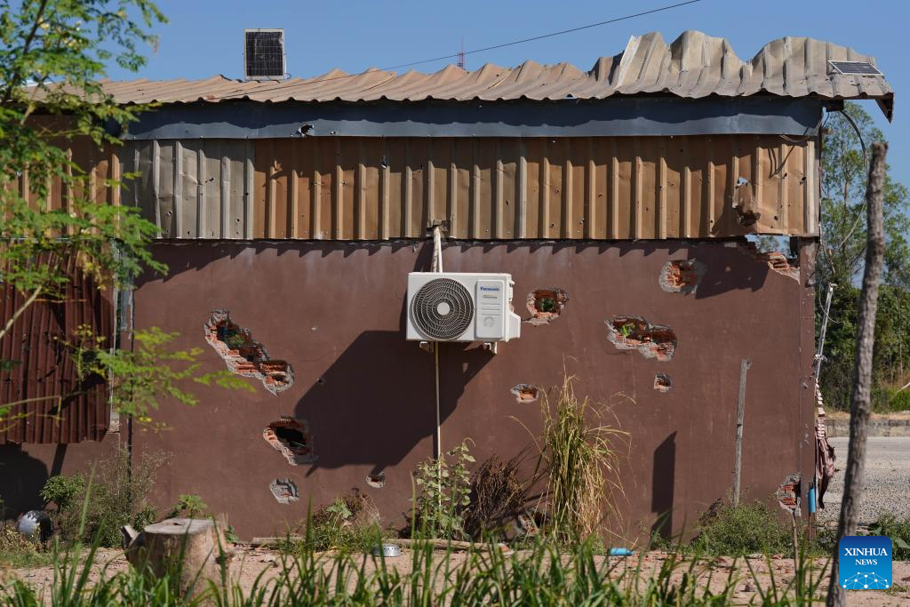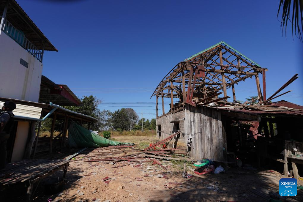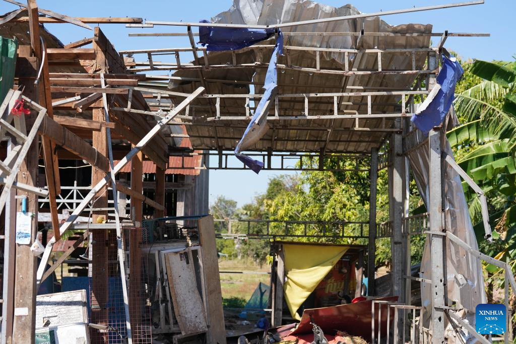 A civilian house damaged by Thailand's artillery shelling is seen in Oddar Meanchey province, Cambodia, Dec. 20, 2025. The civilian death toll in Cambodia has increased to 19, as the renewed border conflict with Thailand has entered its 15th day, according to Cambodia's defense ministry. (Agence Kampuchea Presse/Handout via Xinhua)