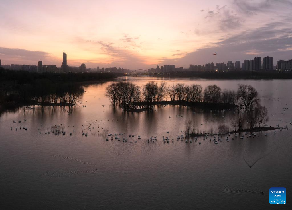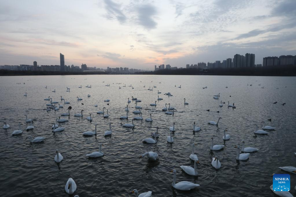 This photo taken on Dec. 21, 2025 shows swans at a wetland in Sanmenxia, central China's Henan Province. A large number of migratory swans have flocked to the Yellow River wetland in Sanmenxia to spend winter. (Photo by Xu Hongxing/Xinhua)