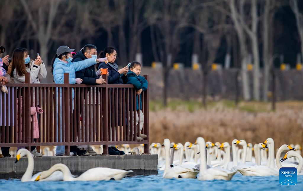 People view swans at a wetland park in Sanmenxia, central China's Henan Province, Dec. 20, 2025. A large number of migratory swans have flocked to the Yellow River wetland in Sanmenxia to spend winter. (Photo by Niu Shupei/Xinhua)