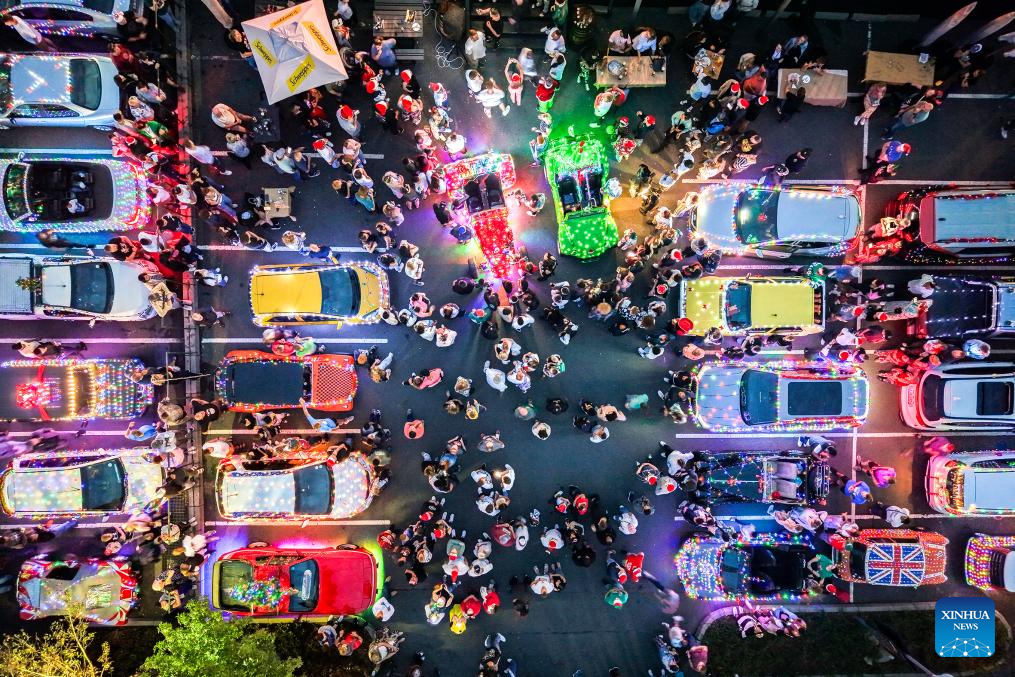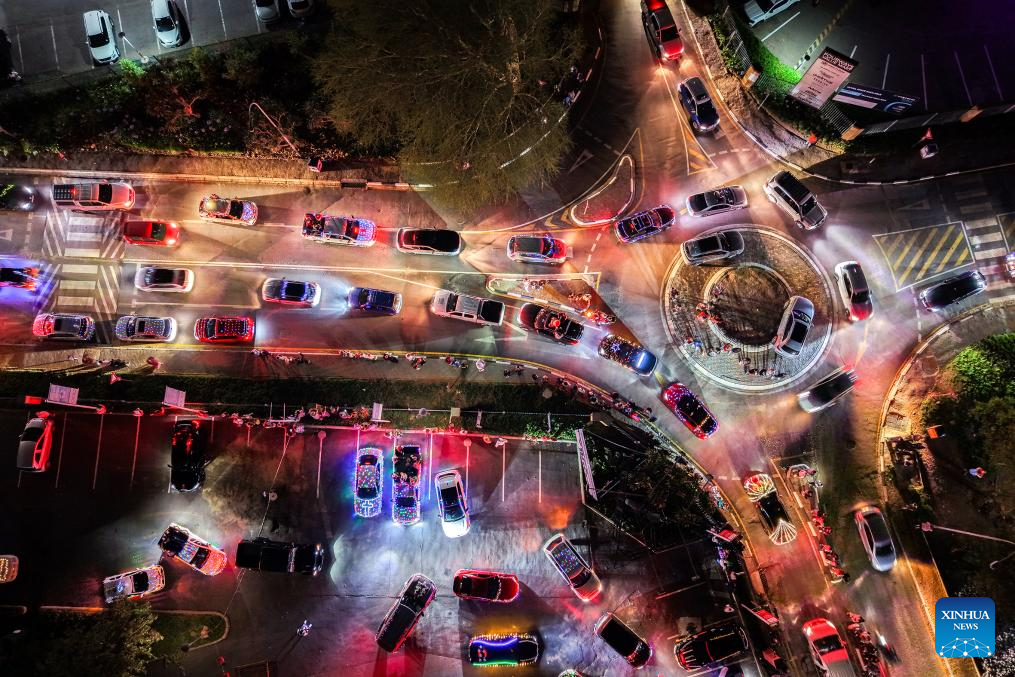 An aerial drone photo shows cars with Christmas-themed decorations in Johannesburg, South Africa, Dec. 22, 2025. Johannesburg has been filled with festive atmosphere as the Christmas approaches. (Photo by Shiraaz Mohamed/Xinhua)