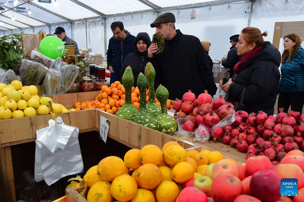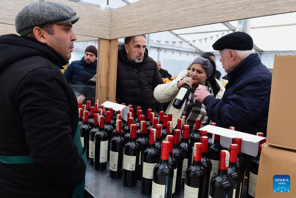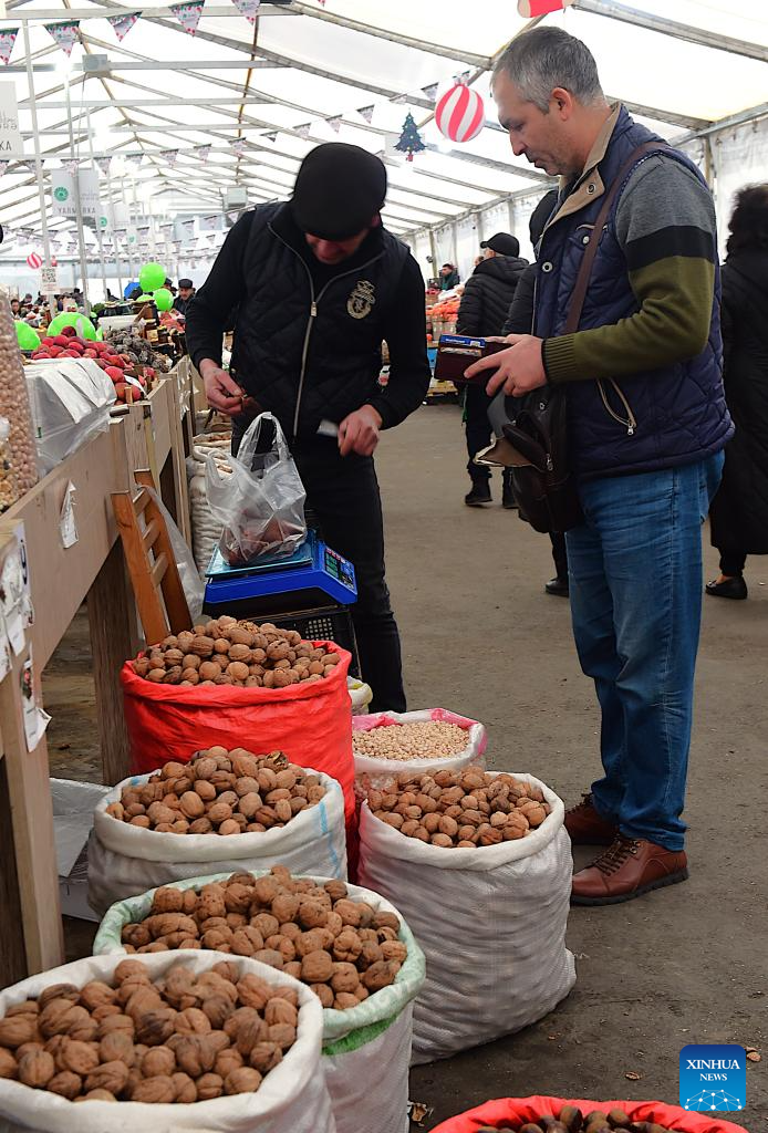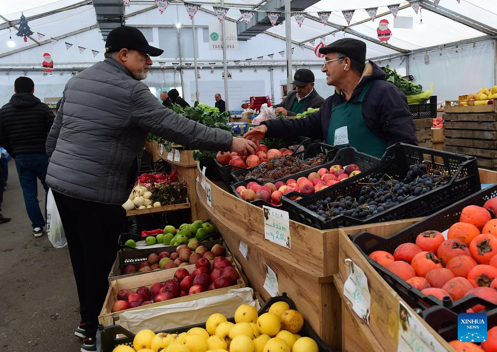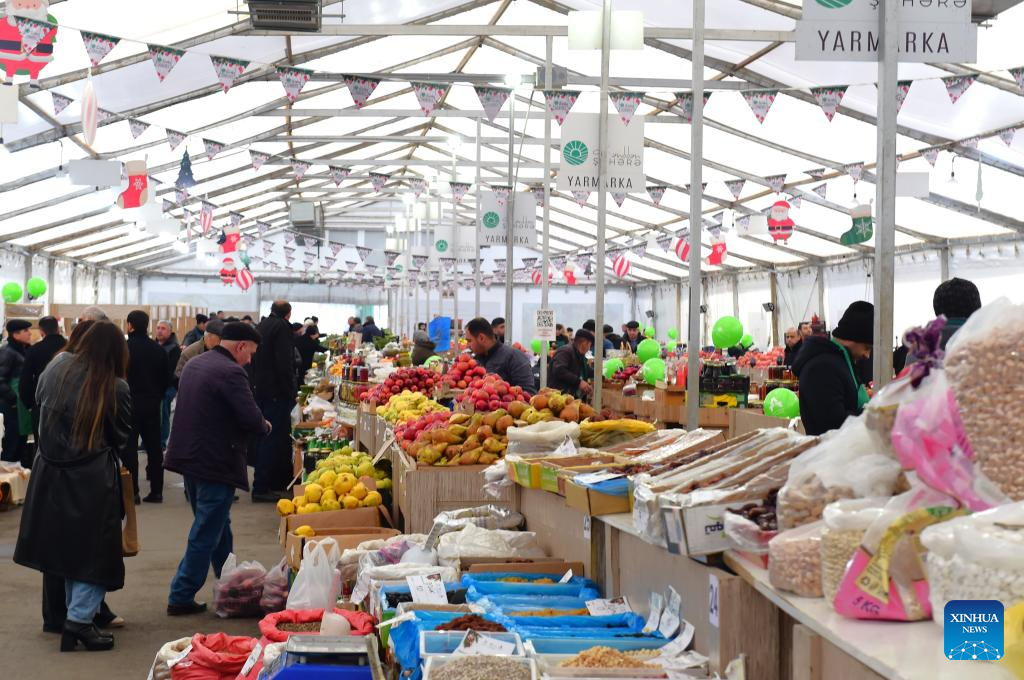 People shop at an agricultural products trade fair in Baku, Azerbaijan, Dec. 21, 2025. With more than 140 specialties from over 80 farms and agricultural product processing enterprises across the country, the trade fair opened here on Saturday, and will run through Dec. 30. (Xinhua/Chen Junfeng)