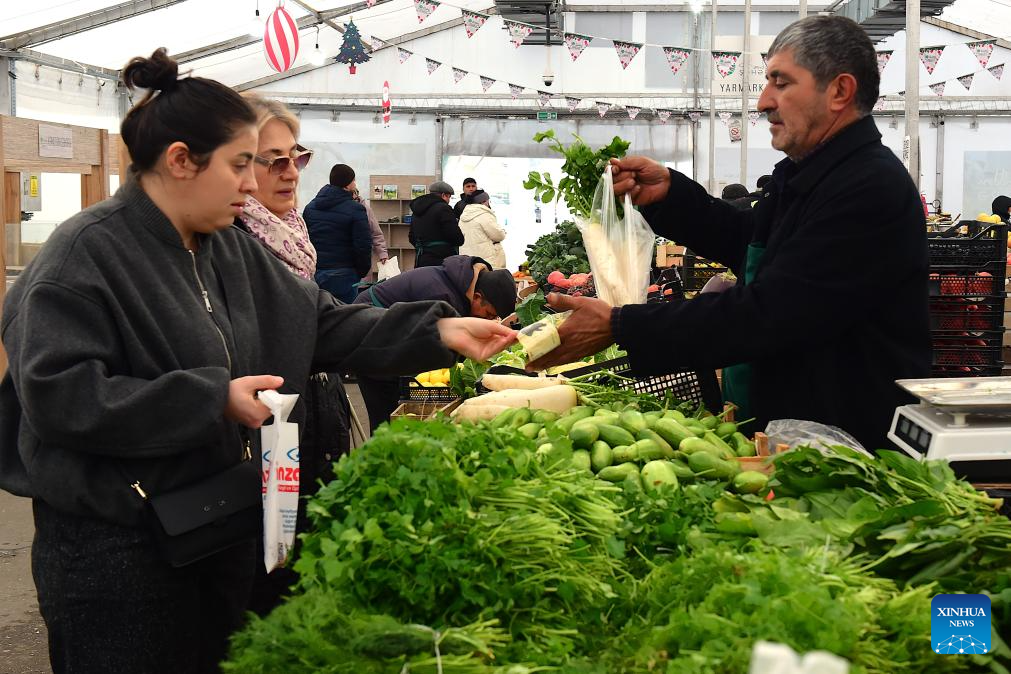 People buy vegetables at an agricultural products trade fair in Baku, Azerbaijan, Dec. 21, 2025. With more than 140 specialties from over 80 farms and agricultural product processing enterprises across the country, the trade fair opened here on Saturday, and will run through Dec. 30. (Xinhua/Chen Junfeng)