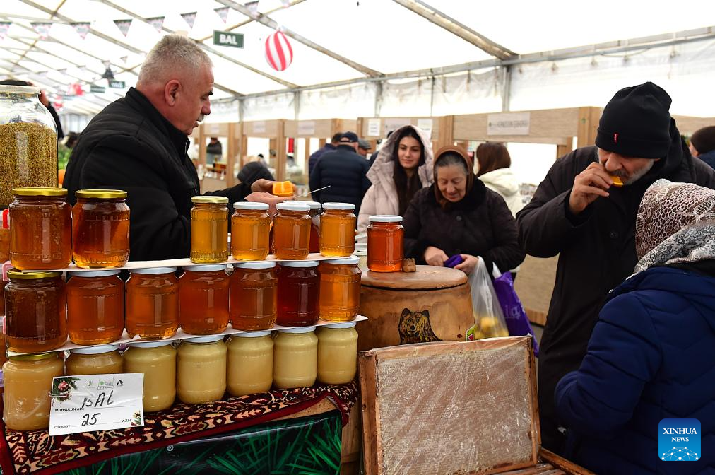 People select honey products at an agricultural products trade fair in Baku, Azerbaijan, Dec. 21, 2025. With more than 140 specialties from over 80 farms and agricultural product processing enterprises across the country, the trade fair opened here on Saturday, and will run through Dec. 30. (Xinhua/Chen Junfeng)