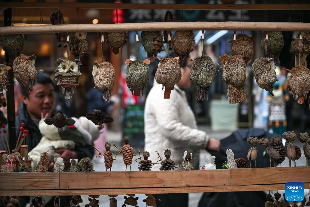 Locals sell cultural and creative products in Zhaoxing Dong village of Liping County, southwest China's Guizhou Province, Dec. 20, 2025.