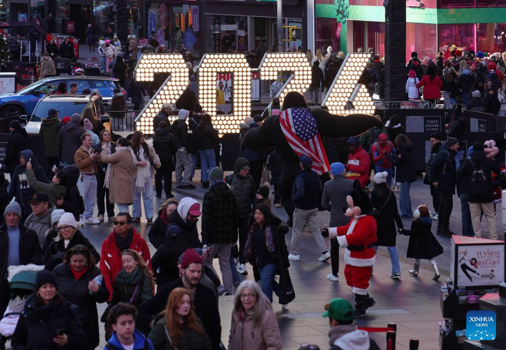 People are seen around a light installation for the upcoming 2026 at Times Square in New York, the United States, Dec. 22, 2025. (Xinhua/Zhang Fengguo)