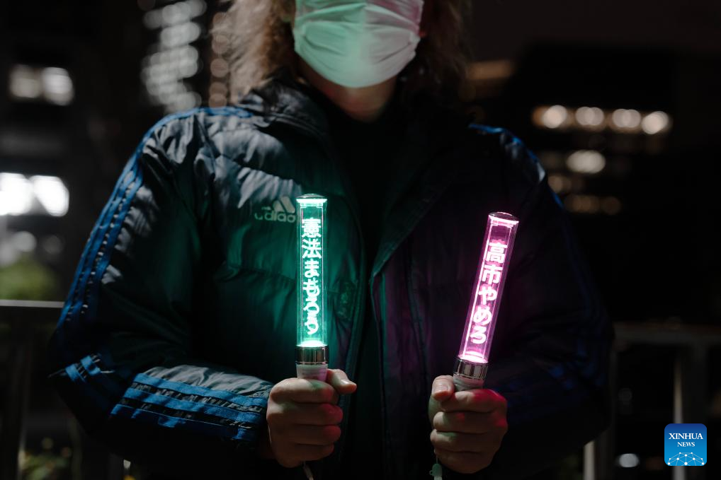 People attend a rally in front of the Japanese Prime Minister's Office in Tokyo, Japan, Dec. 23, 2025. Japanese citizens held a rally on Tuesday evening in front of the Prime Minister's Office in Tokyo, demanding that Prime Minister Sanae Takaichi retract her erroneous remarks on Taiwan and criticizing comments by a senior government official advocating nuclear armament. (Xinhua/Jia Haocheng)