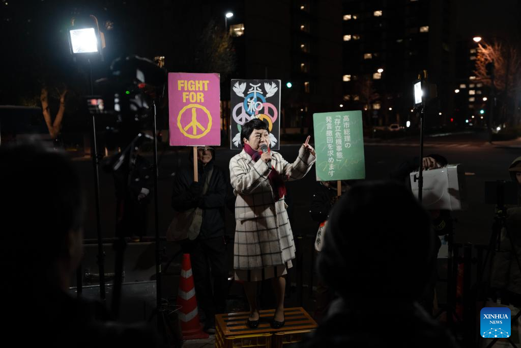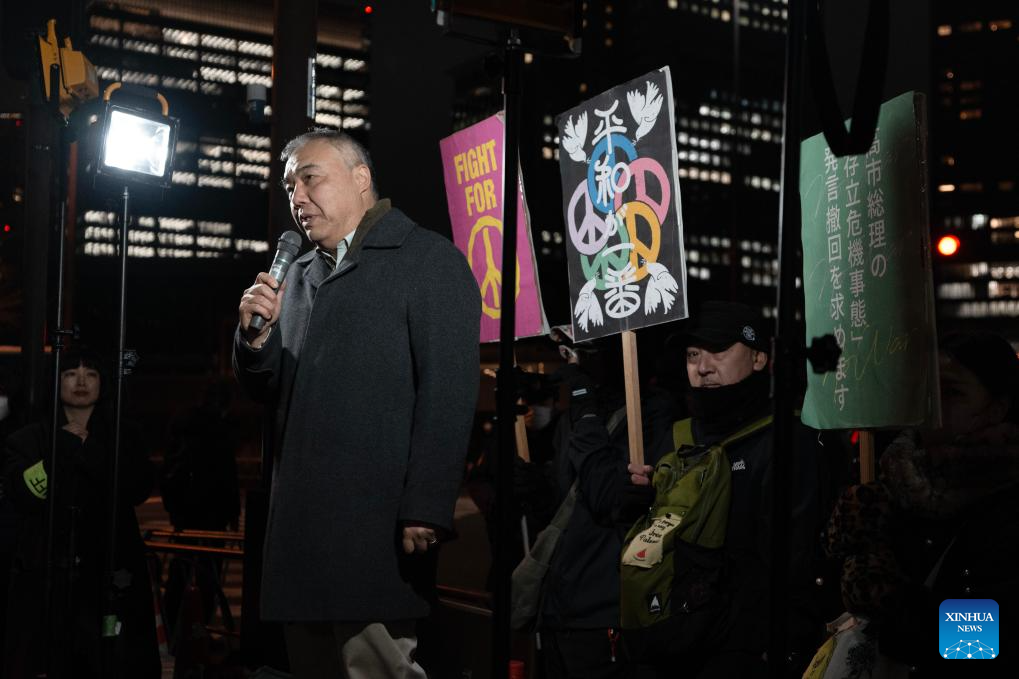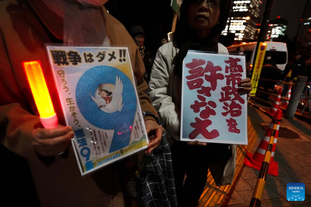 TOKYO, Dec. 24 (Xinhua) -- Japanese citizens held a rally on Tuesday evening in front of the Prime Minister's Office in Tokyo, demanding that Prime Minister Sanae Takaichi retract her erroneous remarks on Taiwan and criticizing comments by a senior government official advocating nuclear armament.