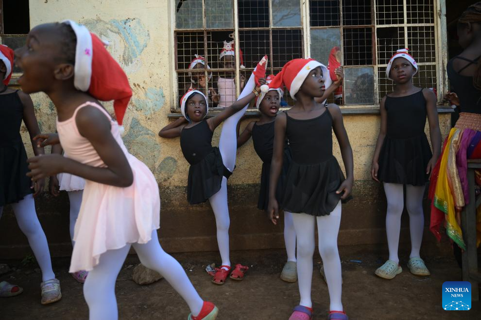 Young dancers perform on a simple stage at the Kibera slum in Nairobi, Kenya, Dec. 23, 2025. A Christmas ballet performance organized by the Kibera Ballet School was held here on Tuesday, attracting many local residents to watch. (Xinhua/Yang Guang)