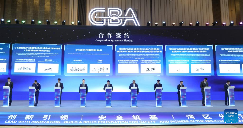 Participants sign cooperation agreements during the 2025 Conference on High-Quality Development of Low-Altitude Economy in Guangdong-Hong Kong-Macao Greater Bay Area (GBA) in Guangzhou, south China's Guangdong Province, Dec. 25, 2025. (Xinhua/Lu Hanxin)