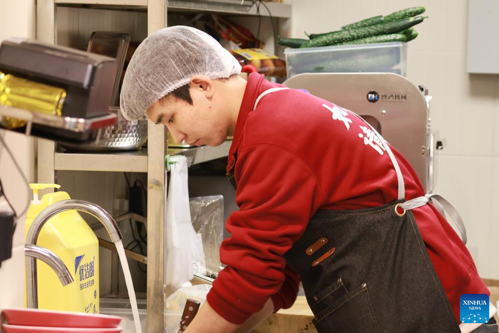ZHENGZHOU, Dec. 25 (Xinhua) -- Each day at 9:30 a.m., the kitchen of Chenjiuye noodle shop slowly comes to life. Zhonghang and his girlfriend are the first to arrive. He unlocks the door, dons his apron and chef's hat before gathering kitchen utensils from the storage cabinet -- a small, familiar ritual that marks the start of another day.