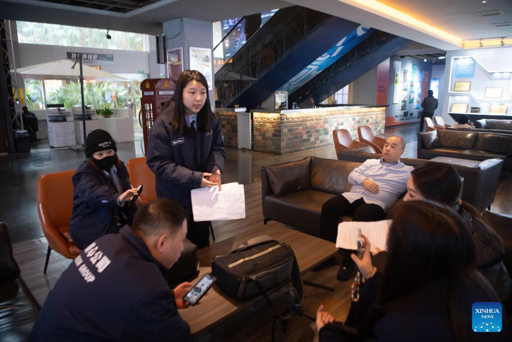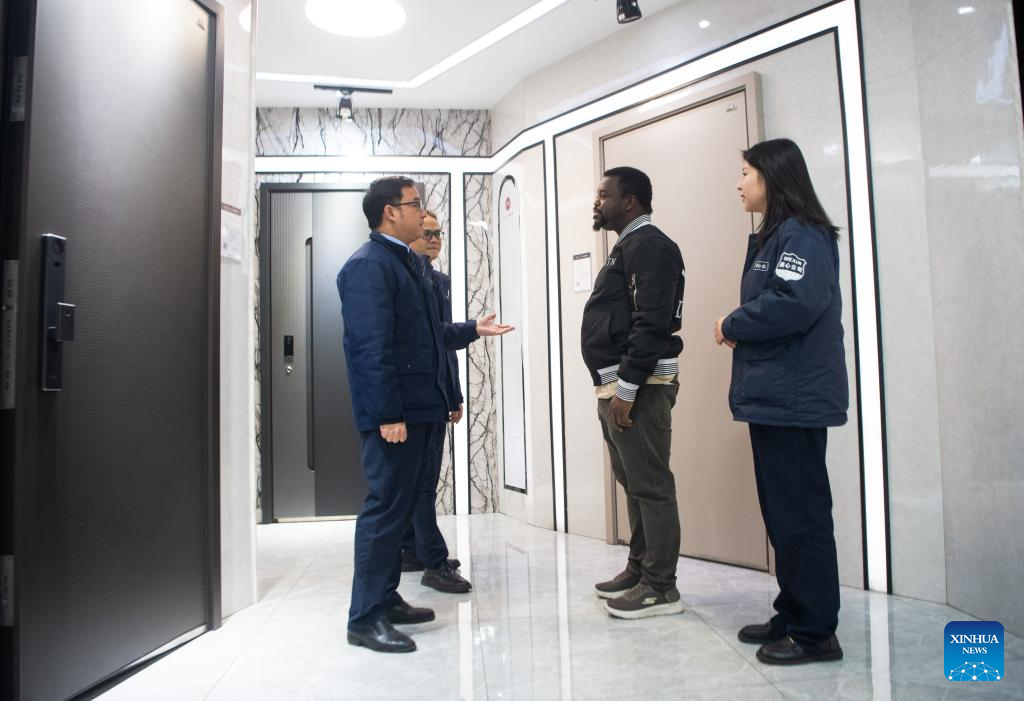 Tang Hexia (1st R) and Deng Yong (1st L) introduce products to a foreign client in southwest China's Chongqing Municipality, Dec. 15, 2025. (Xinhua/Tang Yi)