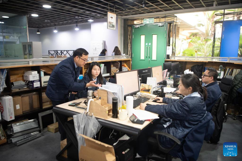 Tang Hexia (L) communicates with colleagues of technical department about customized requirements from overseas clients in southwest China's Chongqing Municipality, Dec. 10, 2025. (Xinhua/Tang Yi)