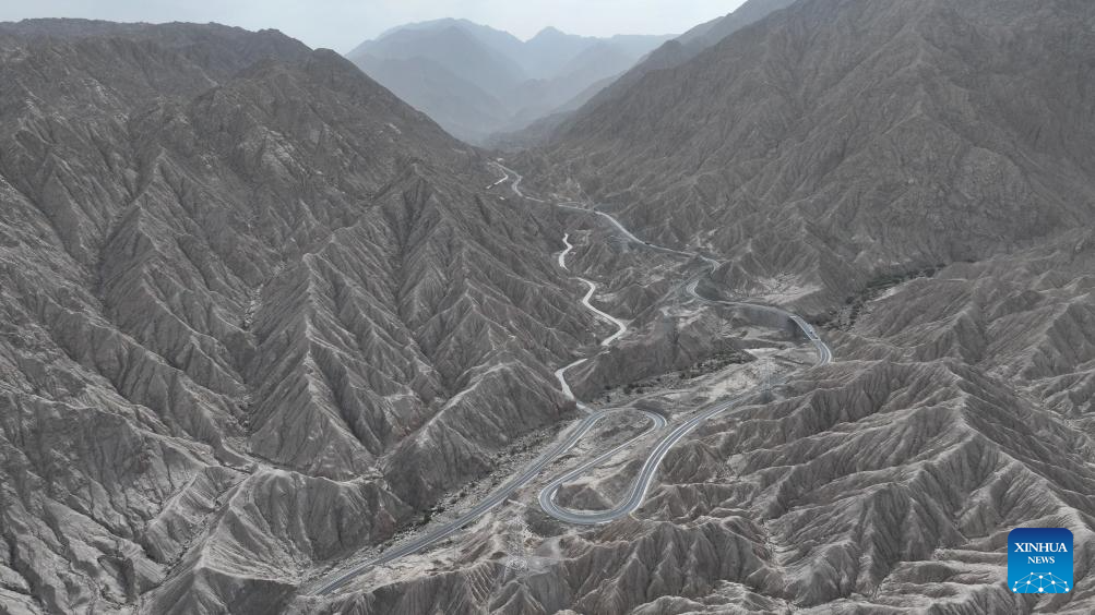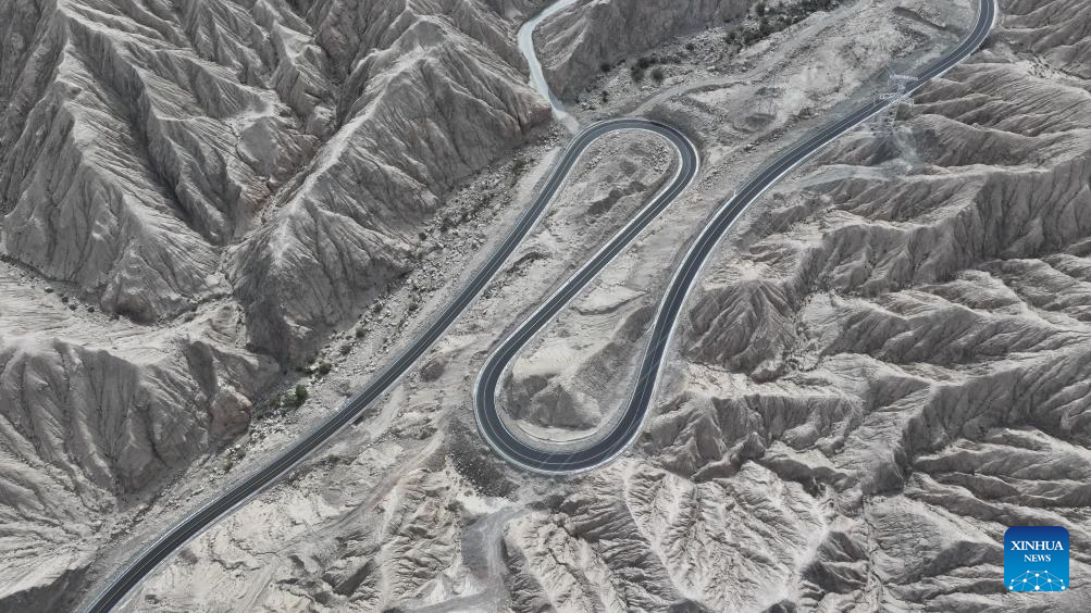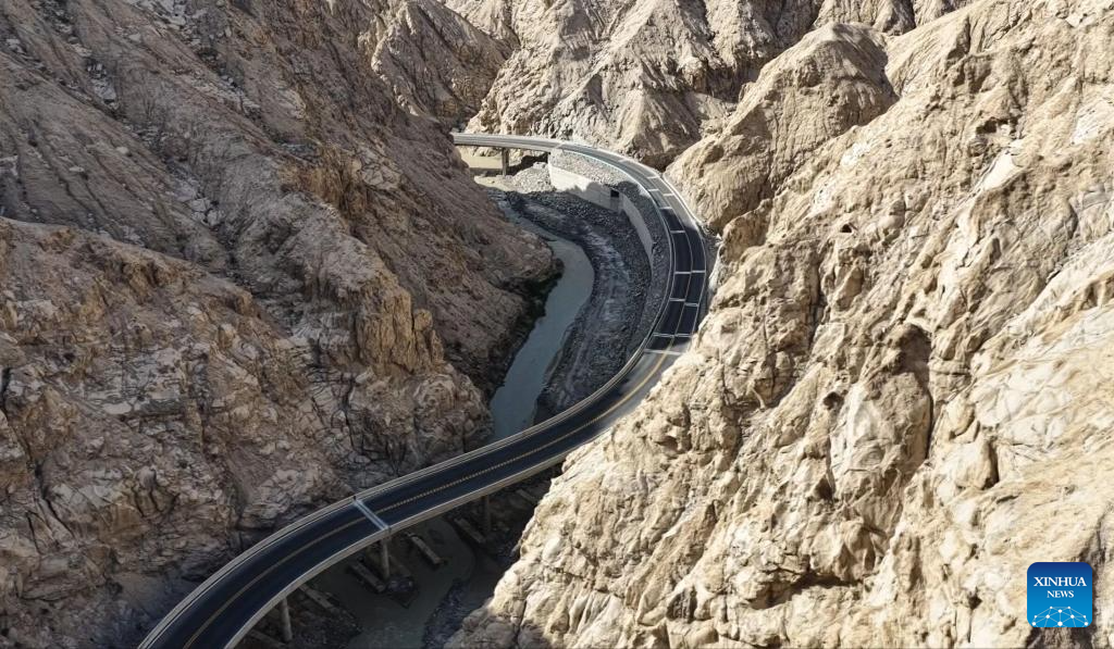 An aerial drone photo taken on Dec. 25, 2025 shows a resource road in Ruoqiang County, Bayingolin Mongolian Autonomous Prefecture, northwest China's Xinjiang Uygur Autonomous Region. With a total length of 98.45 kilometers, the resource road officially opened to traffic on Thursday. The road starts from an industrial park in Ruoqiang County and passes through the Altun Mountains, connecting the mineral-rich areas in southern Ruoqiang County. (Photo by Su Bo/Xinhua)
