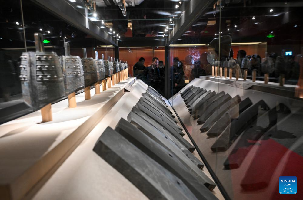 This photo taken on Dec. 26, 2025 shows bronze chimes at the exhibition "Echoes of King Kaolie -- Archaeological Discoveries from the Wuwangdun Tomb No. 1" in the National Museum of China in Beijing, capital of China. The exhibition kicked off here on Friday, featuring more than 200 pieces of exhibits unearthed from the Wuwangdun Tomb No. 1.