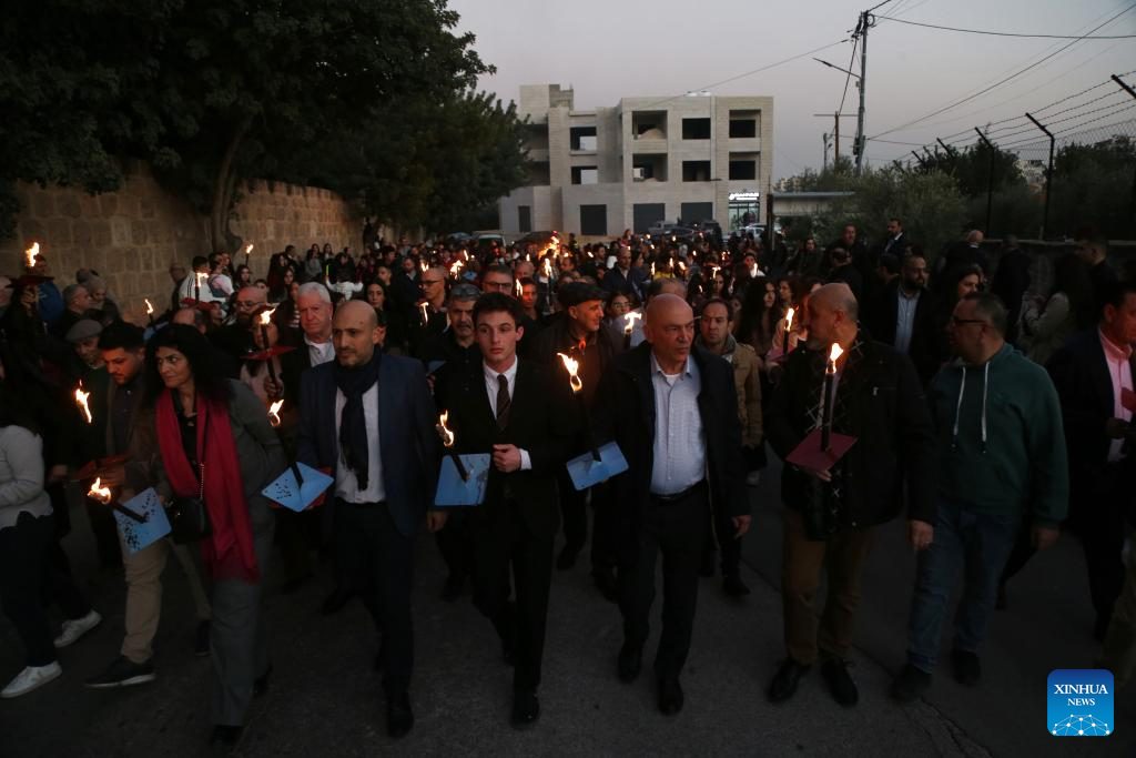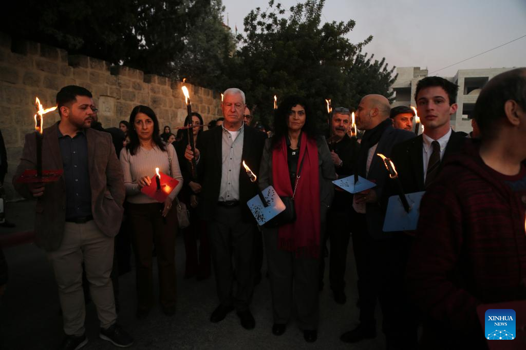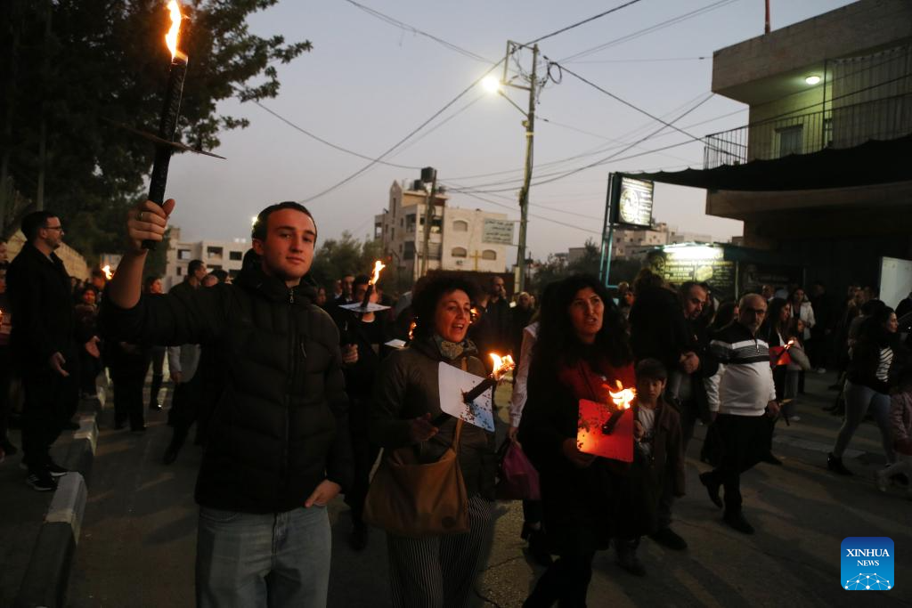 Palestinians participate in a march in the city of Bethlehem, south of the West Bank, to express solidarity with the victims in Gaza and call for an end to the war, on Dec. 25, 2025. (Photo by Mamoun Wazwaz/Xinhua)
