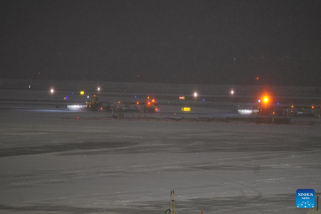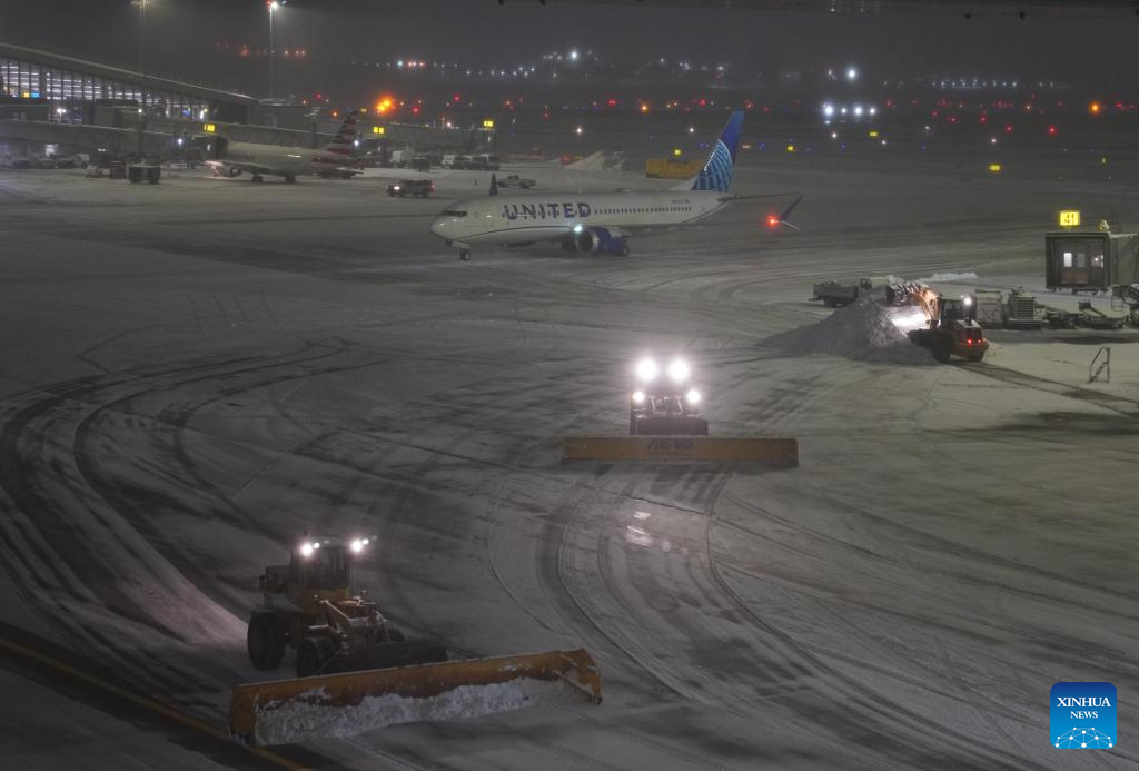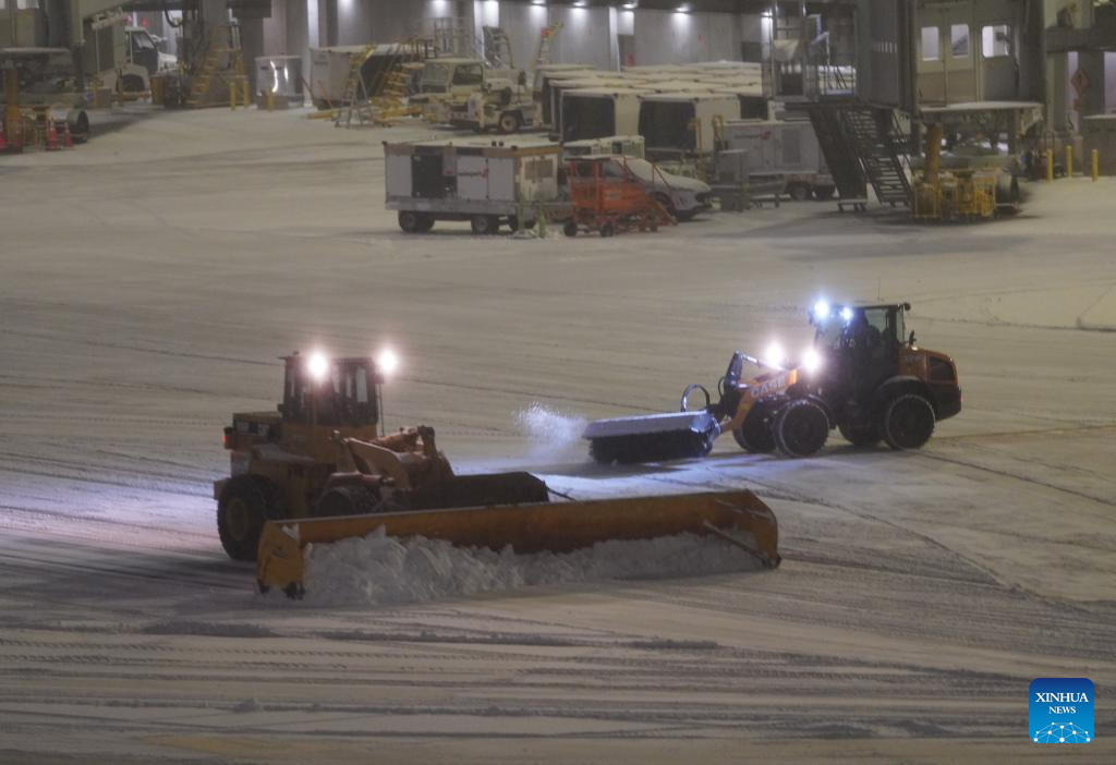 Snowplows clear snow at LaGuardia Airport in New York, the United States, on Dec. 26, 2025. A snowstorm hitting New York on Friday, which has caused flight delays and cancellations. (Xinhua/Zhang Fengguo)