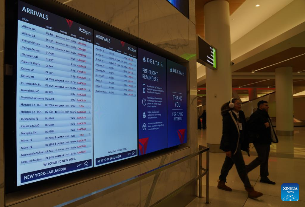 A screen shows many flights cancelled due to a snowstorm at LaGuardia Airport in New York, the United States, on Dec. 26, 2025. A snowstorm hitting New York on Friday, which has caused flight delays and cancellations. (Xinhua/Zhang Fengguo)
