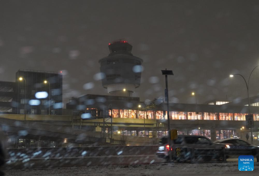 The control tower of LaGuardia Airport is pictured during a snowstorm in New York, the United States, on Dec. 26, 2025. A snowstorm hitting New York on Friday, which has caused flight delays and cancellations. (Xinhua/Zhang Fengguo)