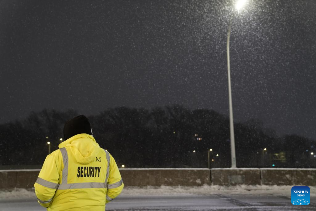 A security personnel is seen in snow at LaGuardia Airport in New York, the United States, on Dec. 26, 2025. A snowstorm hitting New York on Friday, which has caused flight delays and cancellations. (Xinhua/Zhang Fengguo)