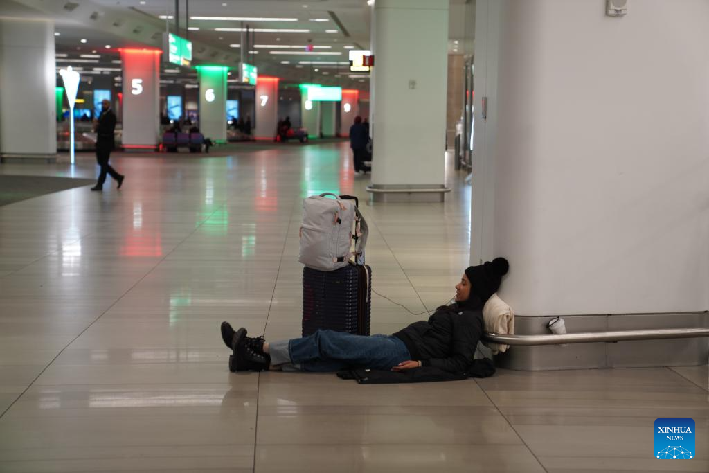A stranded passenger is seen at LaGuardia Airport in New York, the United States, on Dec. 26, 2025. A snowstorm hitting New York on Friday, which has caused flight delays and cancellations. (Xinhua/Zhang Fengguo)