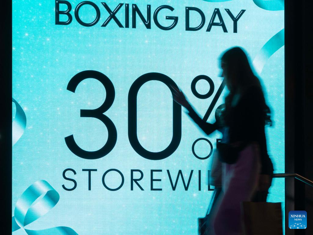 People walk past a Boxing Day promotion sign in Toronto, Canada, on Dec. 26, 2025. (Photo by Zou Zheng/Xinhua)