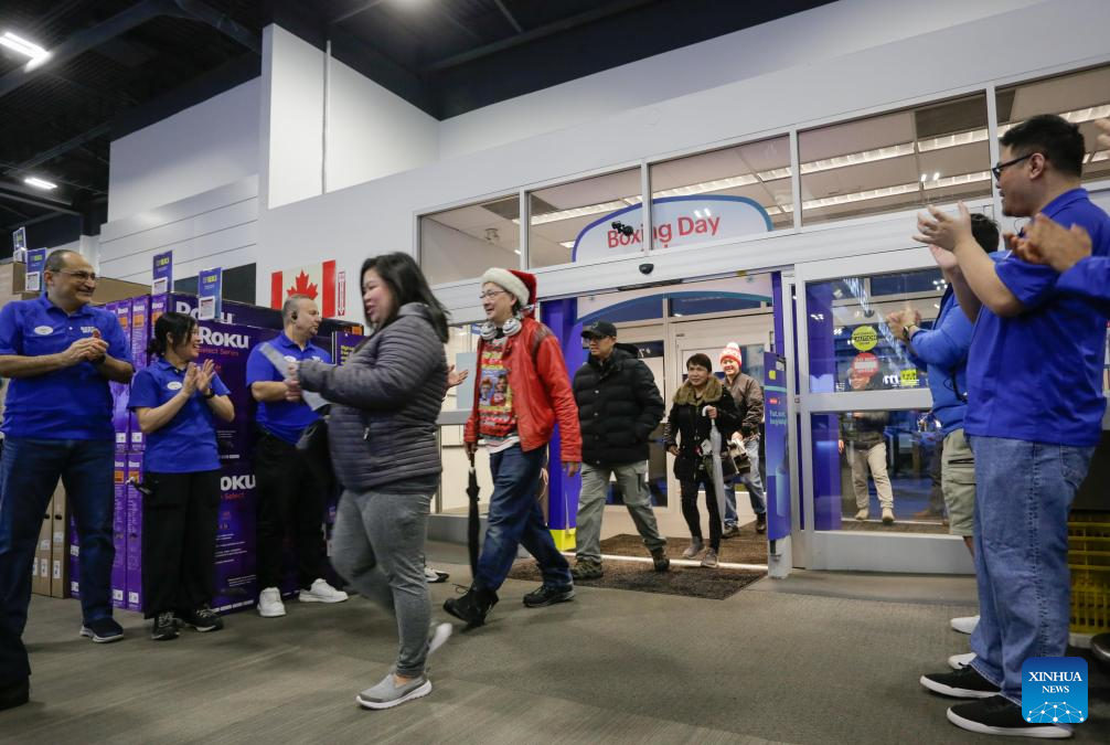Electronics store staff members welcome customers during Boxing Day sales in Vancouver, British Columbia, Canada, Dec. 26, 2025. (Photo by Liang Sen/Xinhua)