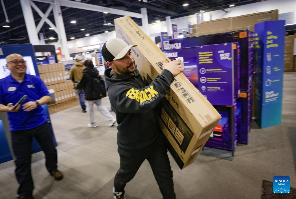 A customer carries a TV during Boxing Day sales in Vancouver, British Columbia, Canada, Dec. 26, 2025. (Photo by Liang Sen/Xinhua)
