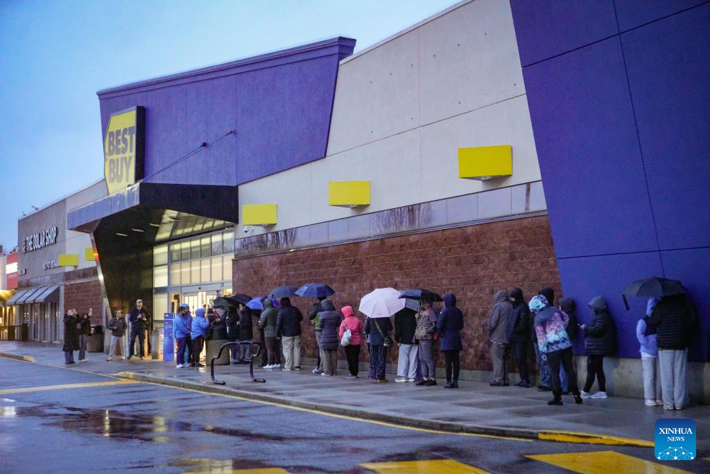 Customers line up outside an electronics store during Boxing Day sales in Vancouver, British Columbia, Canada, Dec. 26, 2025. (Photo by Liang Sen/Xinhua)