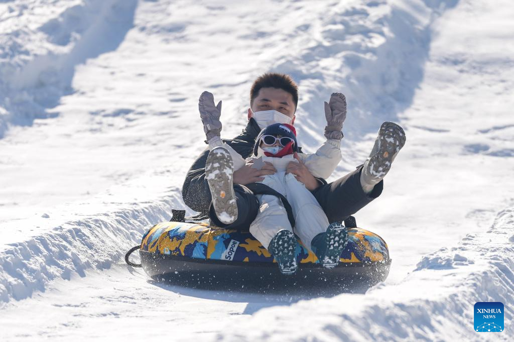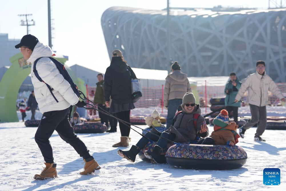 People enjoy sliding on an inflatable snow sled outside the National Stadium, also known as the Bird's Nest, in Beijing, capital of China, Dec. 27, 2025. The winter theme park of the Bird's Nest kicked off on Saturday and will run till late February 2026. The event features an ice and snow activity zone, and an outdoor fashion and leisure zone. (Xinhua/Xie Han)